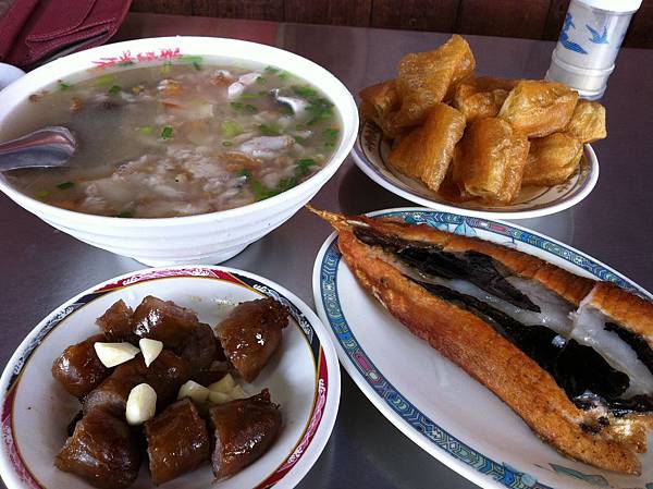 這次點的早餐左上:綜合粥,右上:油條(個人本來就對油條沒興趣,但是看大家桌上都有一盤:p)左下:香腸,右下:乾煎虱目魚