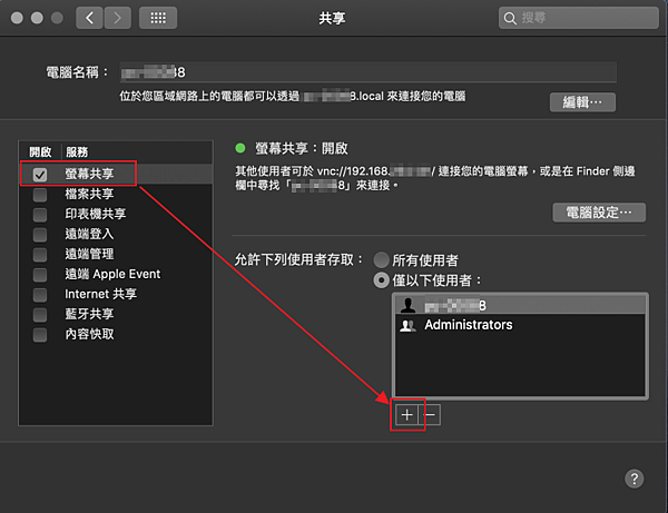 2. 開啟螢幕共享 -> 桉 + 號 允許下列使用者存取