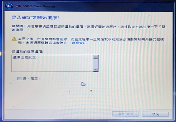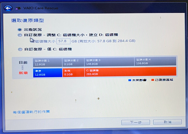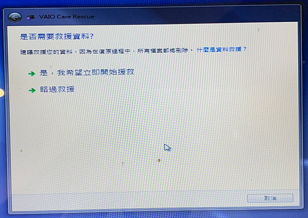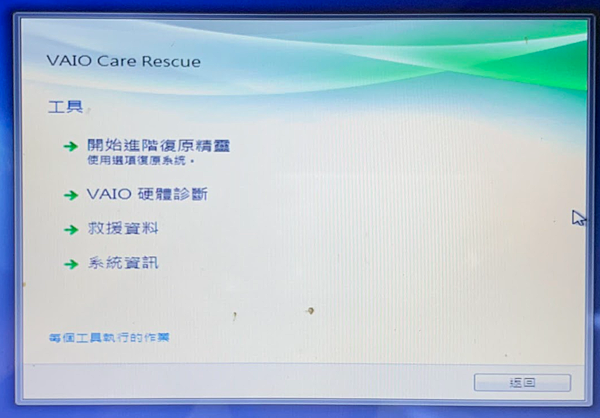 1. 開機時,按 F10 , 進入 vaio care rescue, 救援模式