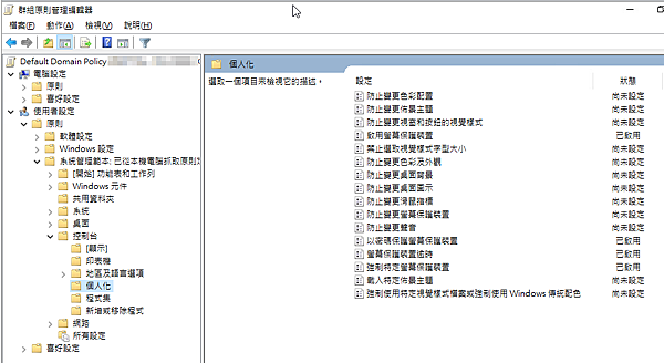 進入到 使用者設定 > 原則 > 系統管理範本 > 控制台 > 個人化