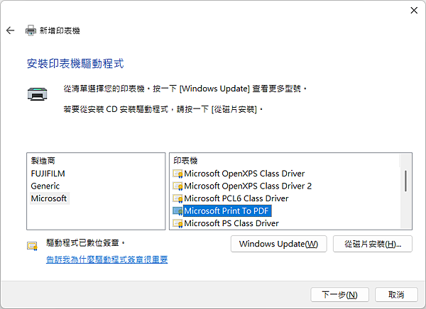 (如果找不到的話,點一次下方的windows update, 等他更新printer 清單, 更新過程真的很慢)